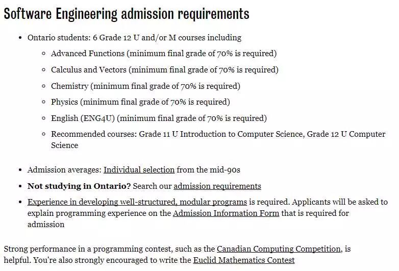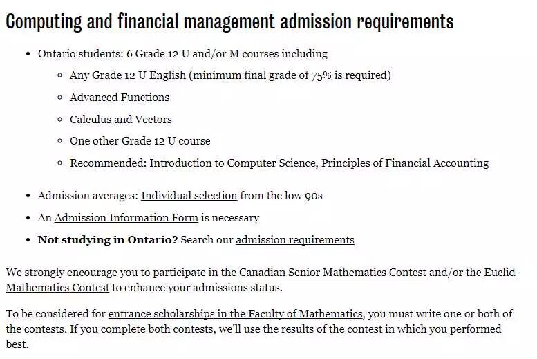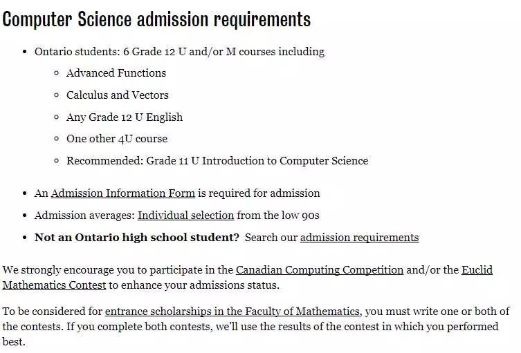 除了在北美非常受认可和欢迎的三个计算机专业:计算机工程,计算机科学,和软件工程 。滑铁卢大学还提供计CFM计算和金融专业Computing and financial management ,(因篇幅和精力有限,Rowling此文只讨论安大略省高中生的申请要求,加拿大其他省和中国高中生升学渠道和要求有所不同)