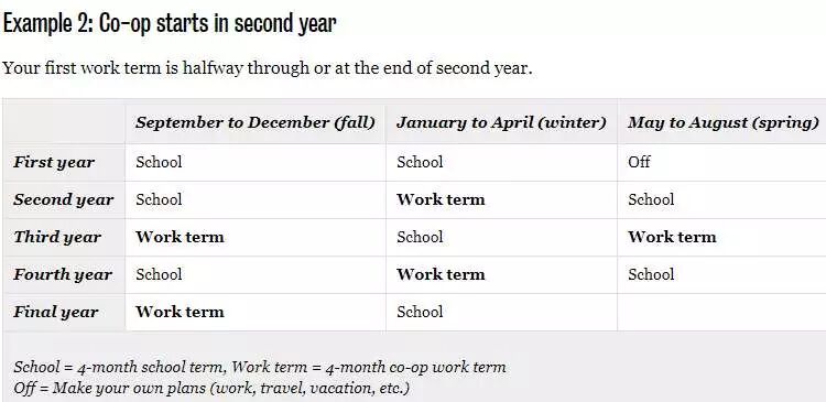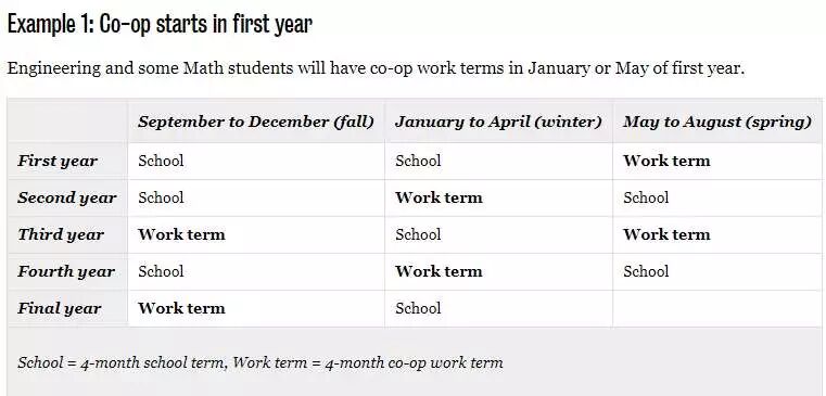 由图可见,滑铁卢大学co-op项目的学生一个学年被分成三个时间段,9-12月是秋季学期,1-4月是冬季学期,5-8月是春季学期。要么工作要么学习,而没有寒假和暑假之分。co-op可谓工作学习两不误,真正的学以致用,把知识运用到工作中去实践。