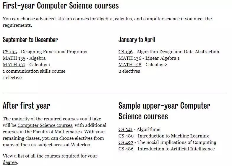 大学第一年的课程与数学院其它的专业类似,必修课主要以数学和逻辑培训为主,并且必须满足数学院的核心课程要求,其中包括一门沟通技巧课。第一个学期将学习的编程语言Racket是 一种Functional Programming语言,第二个学期学的是C语言;第二年才会接触到C++语言。跟其他两个专业相比,CS将学习到更多种类的编程语言和更为牢固的数学根底 ,要求学生具备着扎实的数学基础。
