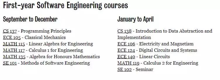 与计算机工程一样,软件工程的学生每学期要上6门课。 软件工程专业录取要求之一是学生必须具备编程的能力。大一期间,软件工程的学生需要上CS137,课程节奏比计算机科学学生上的CS136快很多。而计算机工程的学生需要上ECE150:这门课以初学者较慢的速度介绍C#编程语言。软件工程的学生大一期间直接学习C和C++语言,不会去接触 functional programming。